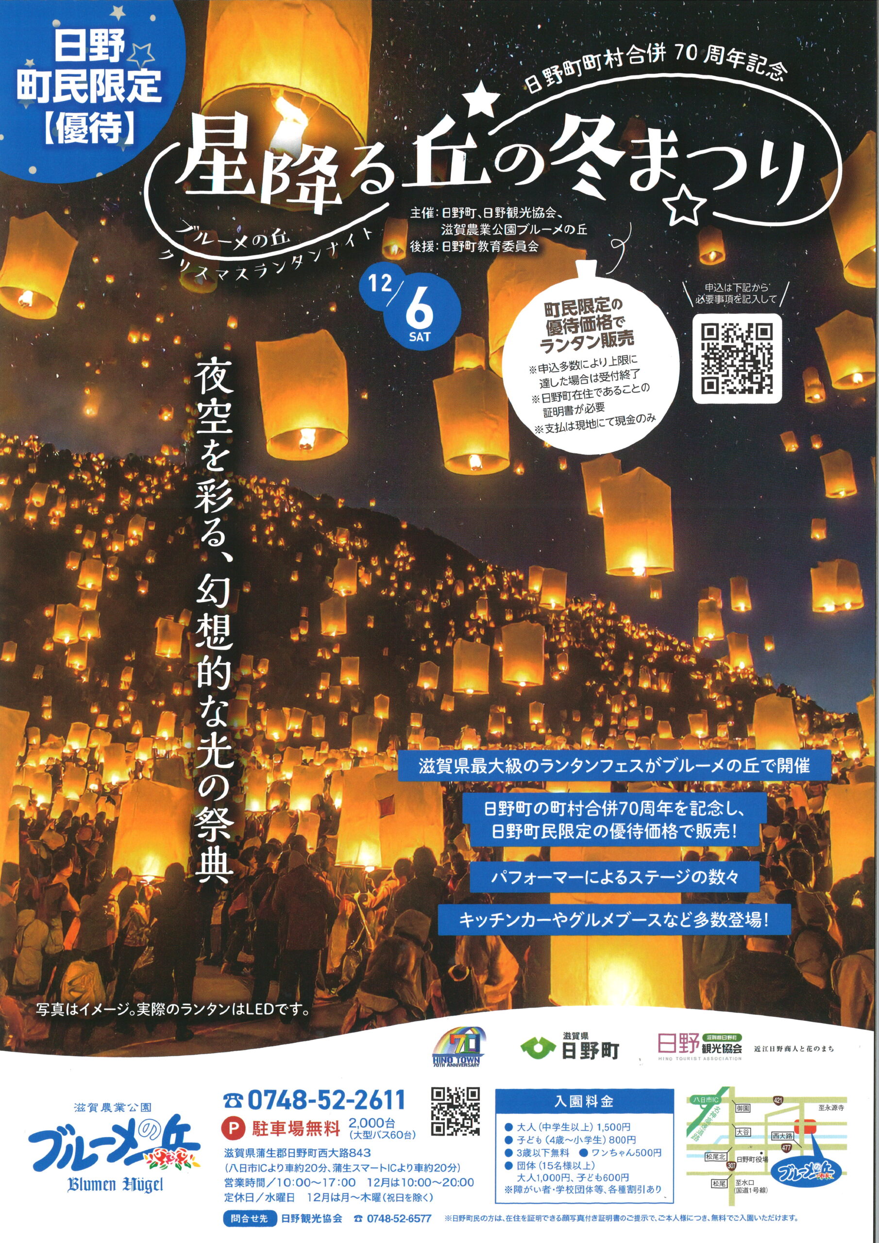 日野町の町村合併70周年を記念し、日野町民限定の優待価格でランタンを販売!当日は、パフォーマーによるステージやキッチンカー、グルメブースなど多数登場します!!