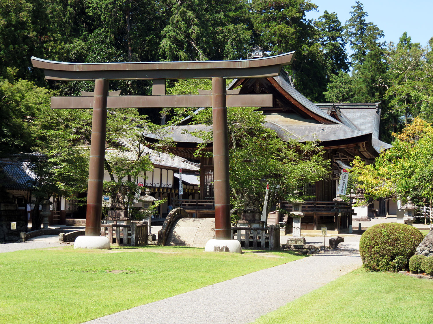 壮大な境内には滋賀県指定文化財の本殿をはじめ、日野商人が寄進した立派な拝殿や絵馬殿・石灯籠・石橋などがあります。